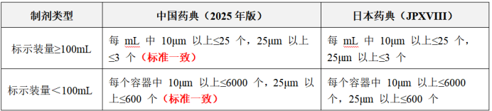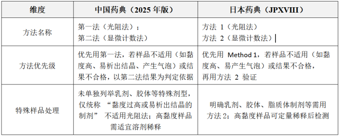 日本藥典(JP XVIII)與中國(guó)藥典(2025 年版)在不溶性微粒檢測(cè)的核心目標(biāo)一致,均為控制注射劑等制劑的微粒污染風(fēng)險(xiǎn),但在檢測(cè)方法細(xì)節(jié)、儀器要求、操作流程、結(jié)果判定及適用范圍等方面存在多維度差異,具體區(qū)別如下: